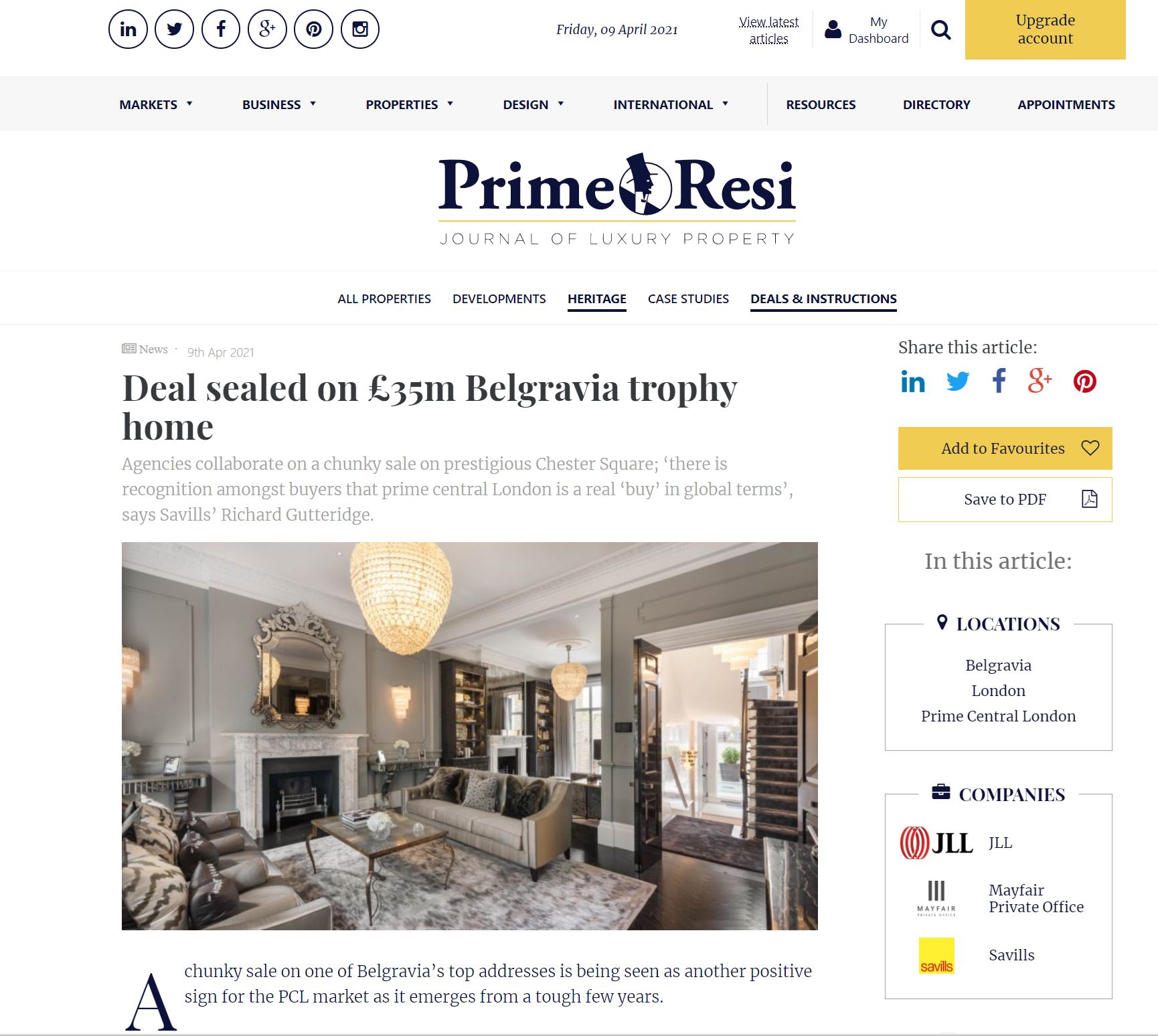 PrimeResi understands a buyer has recently picked up a £35m townhouse and mews combo on the north side of Chester Square, marking one of the largest deals of 2021 so far.