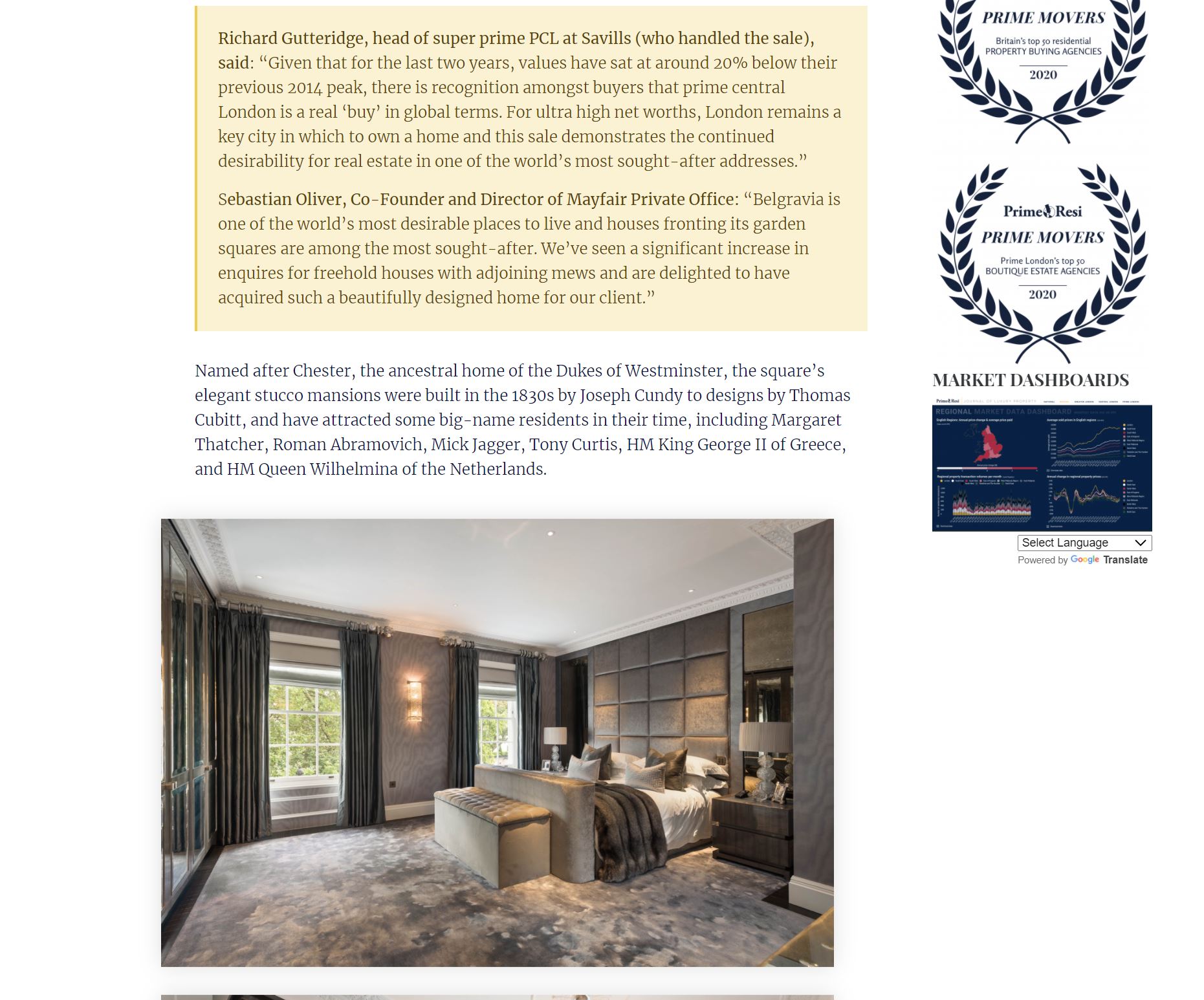 Sebastian Oliver, Co-Founder and Director of Mayfair Private Office: “Belgravia is one of the world’s most desirable places to live and houses fronting its garden squares are among the most sought-after. We’ve seen a significant increase in enquires for freehold houses with adjoining mews and are delighted to have acquired such a beautifully designed home for our client.”