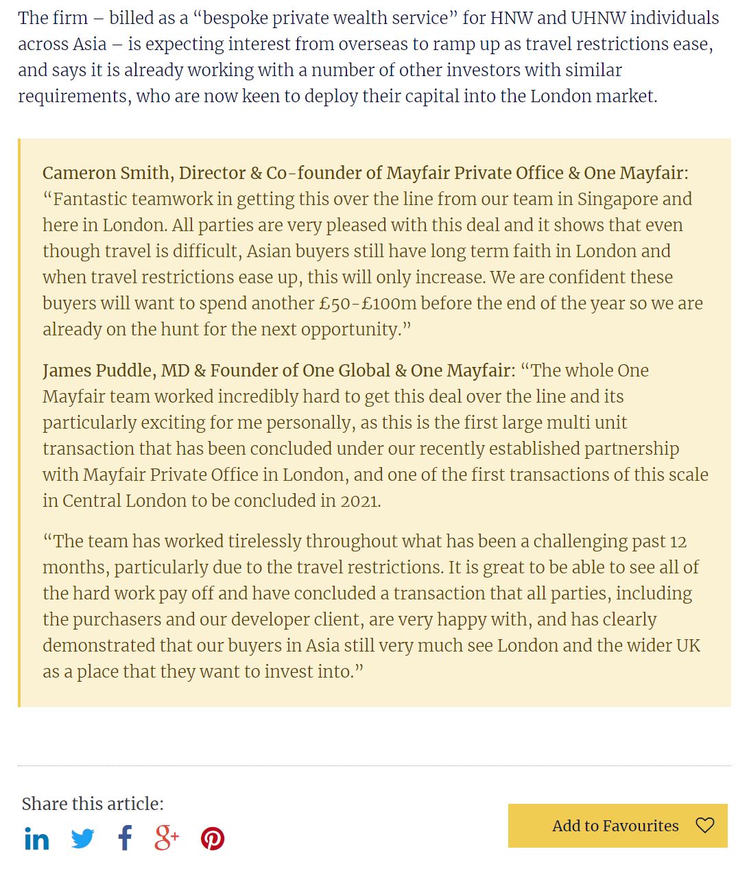 Cameron Smith, Director & Co-founder of Mayfair Private Office & One Mayfair: “Fantastic teamwork in getting this over the line from our team in Singapore and here in London. All parties are very pleased with this deal and it shows that even though travel is difficult, Asian buyers still have long term faith in London and when travel restrictions ease up, this will only increase. We are confident these buyers will want to spend another £50-£100m before the end of the year so we are already on the hunt for the next opportunity.”